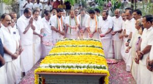 പുതുപ്പള്ളിയിലെ മുന്മുഖ്യമന്ത്രി ഉമ്മന്ചാണ്ടിയുടെ കല്ലറിയില് നിയുക്ത കെപിസിസി പ്രസിഡന്റ് സണ്ണി ജോസഫ് എംഎല്എ വര്ക്കിംഗ് പ്രസിഡന്റുമാരായ പി.സി.വിഷ്ണുനാഥ് എംഎല്എ,എ.പി.അനില്കുമാര് എംഎല്എ, ഷാഫി പറമ്പില് എംപി എന്നിവര് പുഷ്പാര്ച്ചന നടത്തുന്നു.