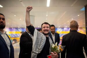 ഖലീൽ തന്റെ ചില പിന്തുണക്കാരെ ആലിംഗനം ചെയ്തു, അവരിൽ പലരും പലസ്തീൻ ലക്ഷ്യത്തോടുള്ള ഐക്യദാർഢ്യ പ്രകടനമായി കെഫിയേ ധരിച്ചിരുന്നു.