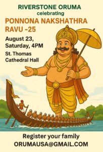 ഓഗസ്റ്റ് 23 ശനിയാഴ്ച്ച വൈകുന്നേരം സെൻറ്റ് തോമസ് ഓർത്തഡോക്സ് കത്തിഡ്രൽ ഓഡിറ്റോറിയത്തിൽ 5 മണി മുതൽ 8 മണി വരെ വർണ്ണ പ്രപഞ്ചമായ പതിനഞ്ചിൽപ്പരം നാട്യ നൃത്ത കലാ പരിപാടികളൾഅരങ്ങേറുന്നു.