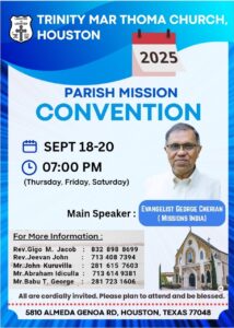 ട്രിനിറ്റി ദേവാലയത്തിൽ ( 5810, Almeda Genoa Rd, Houston , TX 77048) വച്ച് നടത്തപെടുന്ന കൺവെൻഷൻ യോഗങ്ങൾ ഇടവക ഗായകസംഘത്തിന്റെ ഗാനശുഷ്രയോടുകൂടി വൈകുന്നേരം 7 മണിയ്ക്ക് ആരംഭിയ്ക്കും.