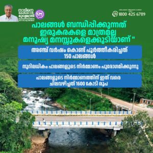 പക്ഷിച്ചിറകിന്റെ ആകൃതിയിലുള്ള ആലപ്പുഴ ജില്ലയിലെ തോട്ടപ്പള്ളി നാലുചിറ പാലം ഇന്ന് മുഖ്യമന്ത്രി ഉദ്ഘാടനം ചെയ്യുകയാണ്. നയനാനന്ദകരമായ കാഴ്ച്ച സമ്മാനിക്കുന്ന ആലപ്പുഴ ജില്ലയിലെ തന്നെ വലിയഴീക്കൽ പാലവും പടഹാരം പാലവും കൂട്ടുംവാതുക്കൽ കടവ് പാലവുമൊക്കെ ഈ സർക്കാരിൻ്റെ കാലയളവിൽ തന്നെയാണ് നാടിന് സമർപ്പിക്കപ്പെട്ടത്. 150 പാലങ്ങളാണ് ഈ സർക്കാർ യാഥാർത്ഥ്യമാക്കിയത്. ഒരു പാലം യാഥാർത്ഥ്യമാകുമ്പോൾ അത് ഇരുകരകളെ മാത്രമല്ല ബന്ധിപ്പിക്കുന്നത്. മനുഷ്യമനസുകളെ കൂടിയാണ്.