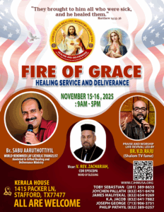 സ്റ്റാഫോർഡ് (ടെക്സസ്): ക്രൈസ്റ്റ് ജീസസ് ഹീലിംഗ് മിനിസ്ട്രി (CJHM) യുഎസ്എയുടെ ആഭിമുഖ്യത്തിൽ നടത്തുന്ന “ഫയർ ഓഫ് ഗ്രേസ്” രോഗശാന്തിയും വിടുതൽ ശുശ്രൂഷയും 2025 നവംബർ 15, 16 തീയതികളിൽ നടക്കും. സ്റ്റാഫോർഡിലെ കേരള ഹൗസാണ് ( 1415 Packer Ln, Stafford, TX 77477) വേദിയാകുന്നത്.