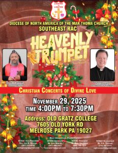 ഫിലഡൽഫിയ – മാർത്തോമാ സഭയുടെ നോർത്ത് അമേരിക്കൻ ഭദ്രാസനത്തിന്റെ ആഭിമുഖ്യത്തിൽ സൗത്ത് ഈസ്റ്റ് റീജനൽ ആക്ടിവിറ്റി കമ്മിറ്റിയും സഭയുടെ സംഗീത വിഭാഗമായ ഡി എസ് എം സി യും സംയുക്തമായി 2025 നവംബർ മാസം 29 ആം തീയതി ശനിയാഴ്ച 4:00 മുതൽ 7 30 വരെ പെൻസിൽവേനിയയിലെ മെല്റോസ് പാർക്കിൽ സ്ഥിതി ചെയ്യുന്ന OLD GRATZ കോളേജ് ഓഡിറ്റോറിയത്തിൽ ( 7605 old York Rd., Melrose Park, PA-19027) വച്ച് നടത്തപ്പെടുന്ന ഹെവൻലി ട്രമ്പറ്റിന്റെ 2025 ഒരുക്കങ്ങൾ പൂർത്തിയായതായി ഭാരവാഹികൾ അറിയിച്ചു.