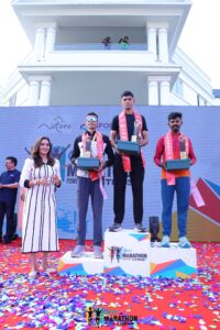 Photo caption: ഇൻഫോപാർക്ക് ക്യാംപസിൽ സംഘടിപ്പിച്ച നാലാമത് ജി- ടെക് മാരത്തൺ 21.1 കിലോമീറ്റർ പുരുഷവിഭാഗത്തിൽ ജേതാക്കളായ സോനു യാദവ് (ഒന്നാം സ്ഥാനം), സജിത്ത് കെ എം (രണ്ടാം സ്ഥാനം), രോഹിത് ഗുർജാർ (മൂന്നാം സ്ഥാനം) എന്നിവർ ട്രോഫിയുമായി.
