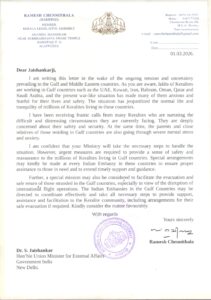 വിദേശകാര്യമന്ത്രി ജയശങ്കറിന് കത്തു നല്കി