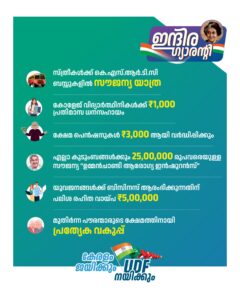 ജനക്ഷേമം, പുതിയ തൊഴില് അവസരങ്ങള്, അന്തസുള്ള ജീവിതം എന്നിവയില് അധിഷ്ഠിതമായ ഗ്യാരന്റികളാണ് യു.ഡി.എഫ് ഈ വാഗ്ദാനങ്ങളിലൂടെ മുന്നോട്ട് വെക്കുന്നത്.