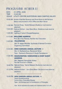 ശ്രീശങ്കരാചാര്യ സംസ്കൃത സര്വ്വകലാശാലയിലെ ശ്രീശങ്കര ജയന്തി ആഘോഷങ്ങള് ഏപ്രില് 21ന് രാവിലെ 10.45ന് കാലടി മുഖ്യകാമ്പസിലെ യൂട്ടിലിറ്റി സെന്റര് ഓഡിറ്റോറിയത്തില് ചാന്സലര് കൂടിയായ ഗവര്ണര് രാജേന്ദ്ര വിശ്വനാഥ് ആര്ലേക്കര് നിര്വ്വഹിക്കുമെന്ന് വൈസ് ചാന്സലര് പ്രൊഫ. സിസ തോമസ് അറിയിച്ചു. പ്രശസ്ത എഴുത്തുകാരന് സി. രാധാകൃഷ്ണന്, സ്വാമി നരസിംഹാനന്ദ എന്നിവര് ശ്രീശങ്കര വാര്ഷിക പ്രഭാഷണങ്ങള്